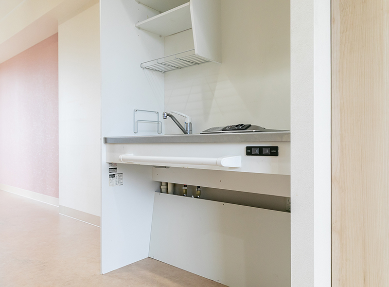 車椅子でも、疲れやすい方でも、膝を奥に入れ、椅子に座りながらの作業ができるよう、奥まで届くように流し台の下に、スペースを空けてあります。