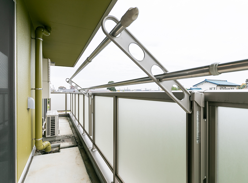 目の前に緑が広がるベランダ。物干しもあり、外で快適に洗濯物を干していただけます。